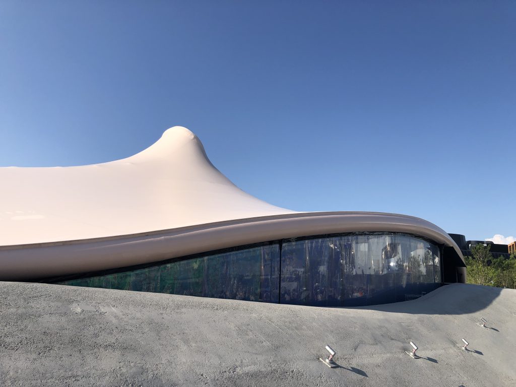 - 外観はペールピンクの曲線膜屋根で、生命の浮遊感を表現